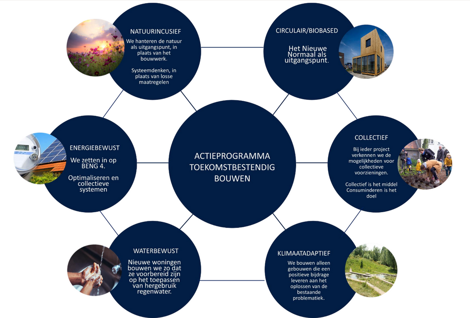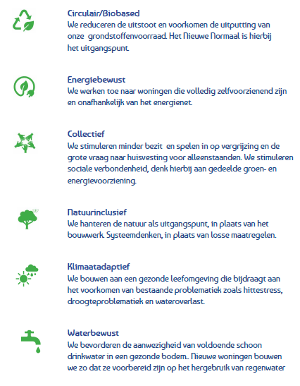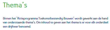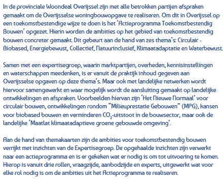 Elk project dat in het Innovatiehuis wordt getoond is uitgewerkt in beeld, toelichting en een score aan de hand van de zes thema's die in het actieprogramma Toekomstbestendig bouwen van provincie Overijssel zijn benoemd.